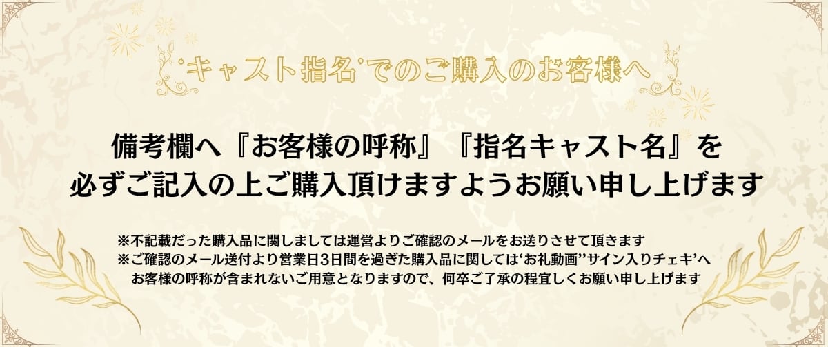 推しの「デコチェキ」をゲット❤️ 推しキャストがデコレーションしたチェキを住所までお送りいたします。 ※備考欄に『お客様の呼称』『キャストの氏名』を記載お願いいたします。 【発送時期に関しまして】 チェキは週ごと第一営業日に発送いたします。 推しキャストが出勤できない場合は発送が遅れてしまいますのでご了承お願い申し上げます。